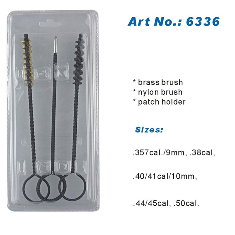 طقم تنظيف المسدس مكون من 3 قطع، معبأة في نفطة مزدوجة. فرشاة تنظيف واحدة من النحاس، وفرشاة تنظيف واحدة من النايلون وحامل رقعة مشقوقة. مفيد وفعال.