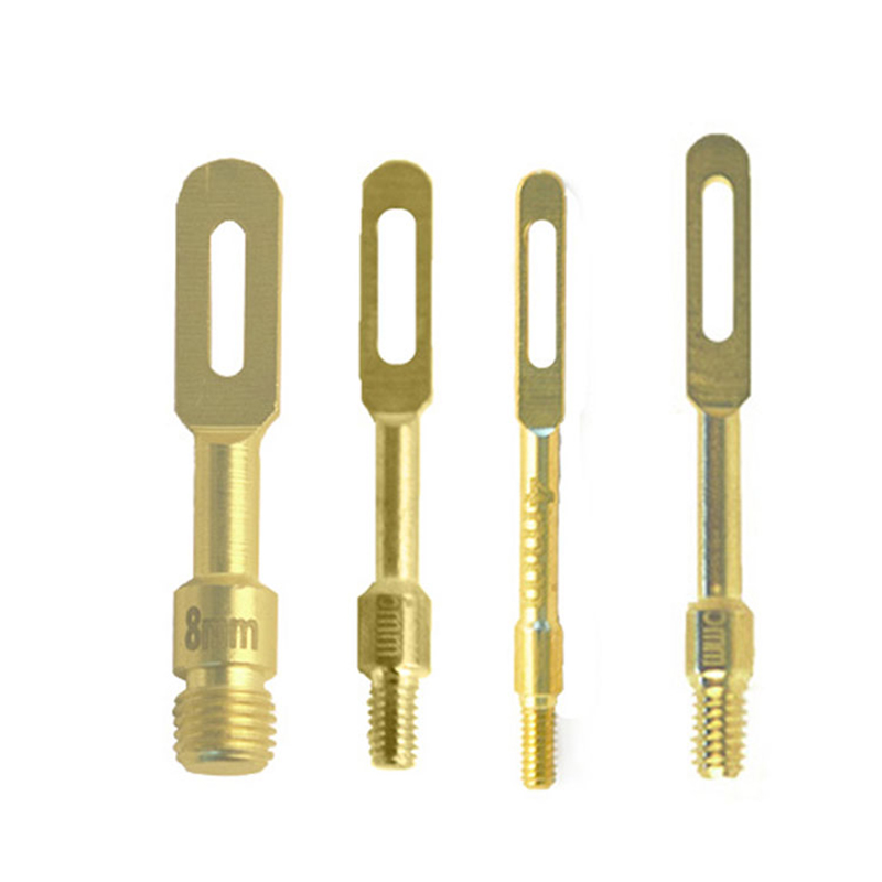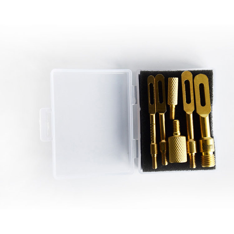 حاملات رقعة تنظيف البندقية ومحولاتها المكونة من 6 قطع، وحوامل رقعة تنظيف المسدس المكونة من 6 قطع/أطراف مشقوقة ومحولات توصيل القضبان المعبأة في علبة واحدة صغيرة هي مجموعة تنظيف عالمية لمسدسات البنادق تناسب جميع العيارات. يسمح لك المحولان بتوصيلهما على قضبان التنظيف في صواميل لولبية مختلفة. ضع رقع التنظيف من خلال الفتحة المشقوقة، ثم قم بإسقاط المذيب أو زيت البندقية لتنظيف التجاويف.