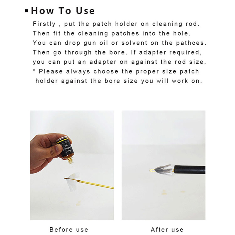 ● 4 أحجام من حاملات/أطراف تنظيف الأسلحة المشقوقة يمكن أن تلبي العيارات من .177 كالوري/4.5 ملم إلى 12 مقياسًا، مناسبة للبنادق والمسدسات والبنادق.