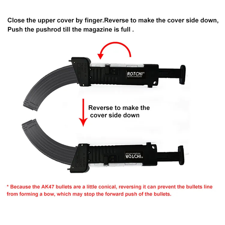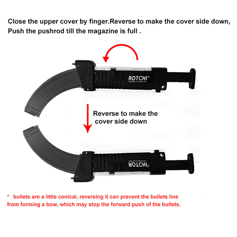 ● تستخدم لتحميل خراطيش مقاس 7.62 × 39 مم في مجلة AK بسعة أكبر 10/20/30 أو أكثر.